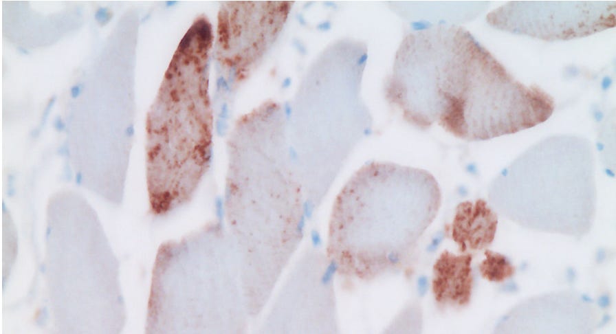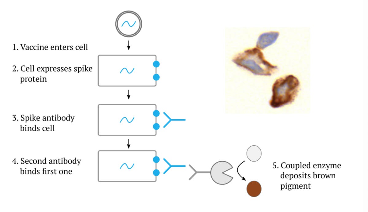 Expression of spike protein in shoulder muscle after vaccine injection. (Michael Palmer, MD, Sucharit Bhakdi, MD)[/caption]